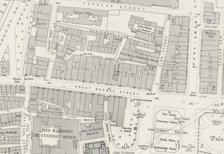 Mary and William Ambler, in 1901, were living at 34 Great George Street, in the heart of Westminster. William was employed as a Land Agent’s Clerk. The street appears to have been something of a centre for this profession – the Surveyor’s Institution was at number 12 and one of the leading agencies, Rawlence and Squarey, who undertook at a significant price the training of land agents, were at number 22. The houses were subsequently replaced by government offices.