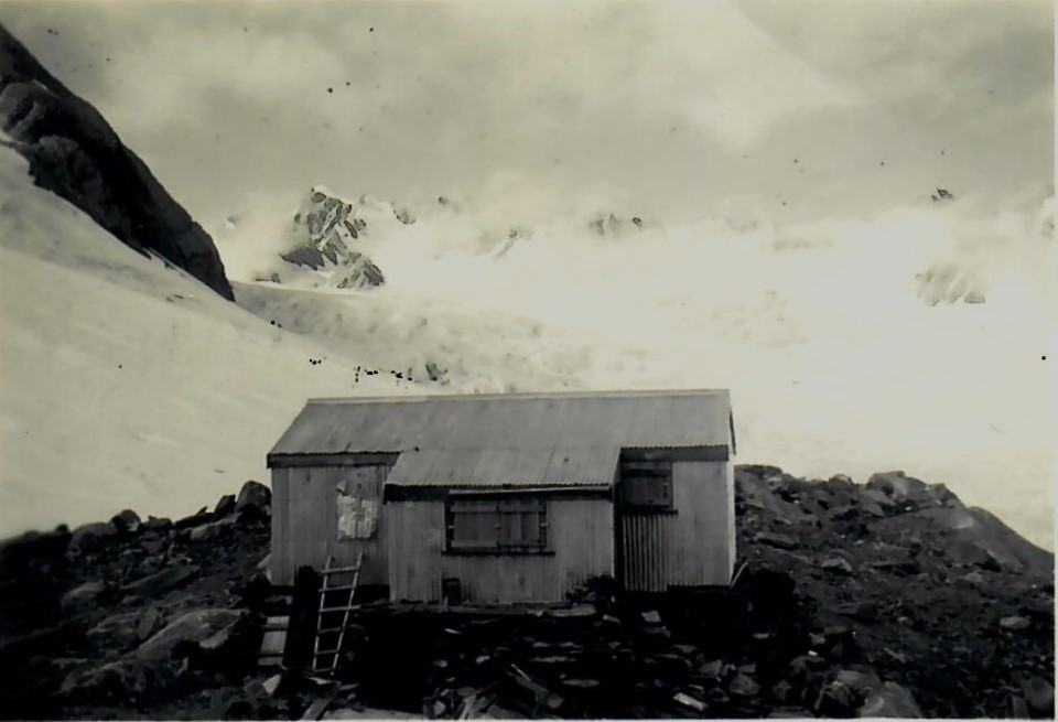 On Wednesday 16th April, Peter McCormack, was guiding Mum, with the intention to cross the Graham Saddle. They had climbed Mount Moltke and stayed a night at Defiance Hut. The following day, they crossed the Franz Josef glacier intending to spend the night in the Almer Hut. When they got to the hut, they found the door snibbed from the inside and muffled sounds emanating from within. Their attempts to break into the hut roused the inhabitant and they discovered Roy, seemingly delirious, bruised, gaunt and with frostbitten feet. He gave a confused account of an accident on the Rudolf Glacier, on the Eastern side of Graham Saddle and told them that his companion, Gerald, was dead.