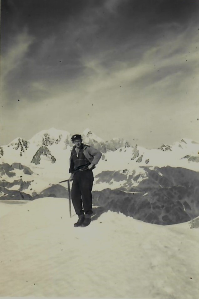 Peter McCormack, aged 29, was a third generation West Coaster. His father and grandfather were gold miners. The McCormack family initially lived on a gold-mining claim at Gillespies Beach, near Fox Glacier but Peter mainly grew up in Franz Josef/ Waiao, where his father worked sporadically as a barman but spent most of his time gold prospecting unsuccessfully up the Callery and Waiho rivers. His mother worked in the hotel kitchen to support the family. Peter worked as a farmhand in Franz Josef, then enlisted for WWII and did his training in Blenheim, only to be manpowered home as farming was an essential industry. He worked on the farm owned by the Grahams, who also had the Glacier Hotel, and who introduced him to mountaineering. He started guiding on Franz Josef in 1946.