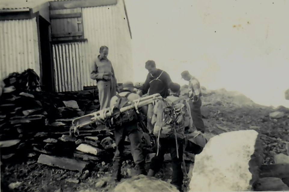 It was agreed that Mum would remain overnight in the hut with Roy, while Peter returned to the Franz Josef hostel to raise a rescue party, making the descent in an hour and a half – a record time. A party was dispatched from the Franz Josef hostel and another from the Hermitage, with a third setting off from Timaru. Mum often recalled how afraid she had been during that night. She bathed Roy’s feet with warm water and worried for years after that she had done the wrong thing. He wouldn’t eat, and she tried to encourage him to drink water. In the middle of the night, she went outside to escape his moaning and raving.