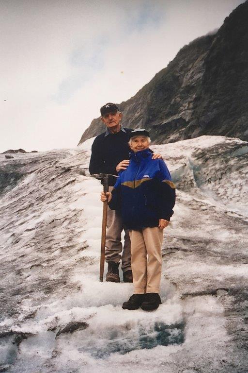 Peter was a highly respected guide on the Franz Josef Glacier for over thirty years, until his retirement in 1982, when he was awarded the Queen’s Service Medal for public services. In retirement, he travelled to the mountains of Switzerland and Canada; however, his heart was always in Franz Josef. Peter died in April 2018, aged 95, the year after his wife Elizabeth. They were survived by their two daughters, Trish and Annie.